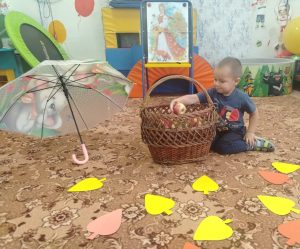 Вместе с золотой осенью ребята украсили осенними листочками дерево. Ну до чего ж красиво! Запоминающимся был сюрпризный момент, подарок от щедрой Осени – полная корзина яблок!